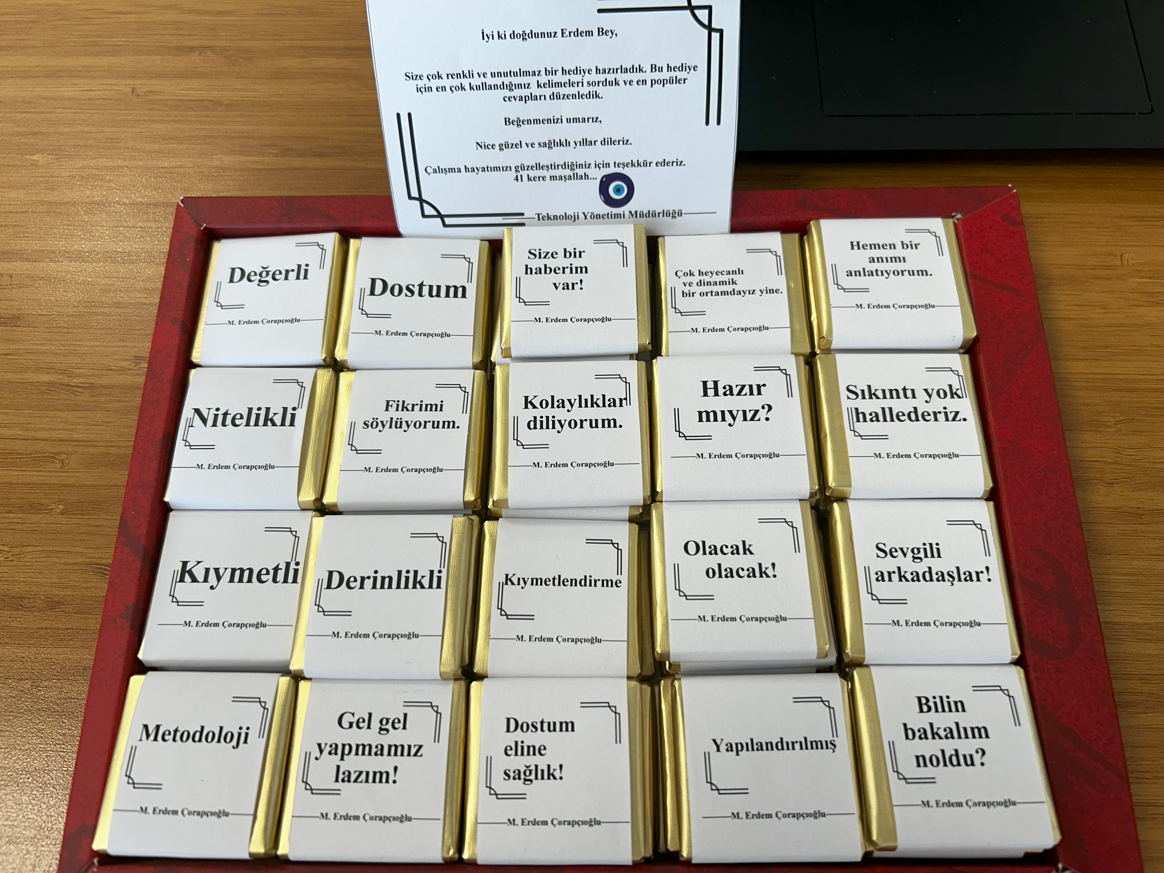 Aşağıdaki fotoğrafta değerli çalışma arkadaşlarımın sıklıkla kullandığım ifadelerden derledikleri bir çikolata kutusu yer alıyor. Bu liste için bir anket hazırlanmış ve öne çıkanlar bir araya getirilmiş. Çalışma arkadaşlarımın doğum günüm için hazırladıkları bu sürpriz beni derinden etkiledi.